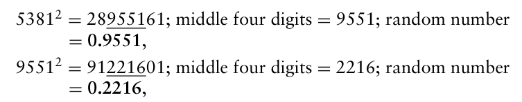 가장 초기의 의사난수 생성기 중 하나는 midsquare technique 이라고 부르는데, 시드를 제곱한 후에 중간 자리 숫자 집합을 다음 난수로 사용하는 방식이다.