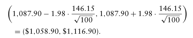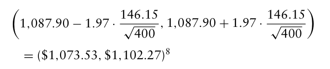 4.2장의 예시를 가져오면, 100개의 시나리오에 대해 1년 후 평균 자본은 $1,087.90 이며, 95% 신뢰구간은 (1058, 1116.9)였음.