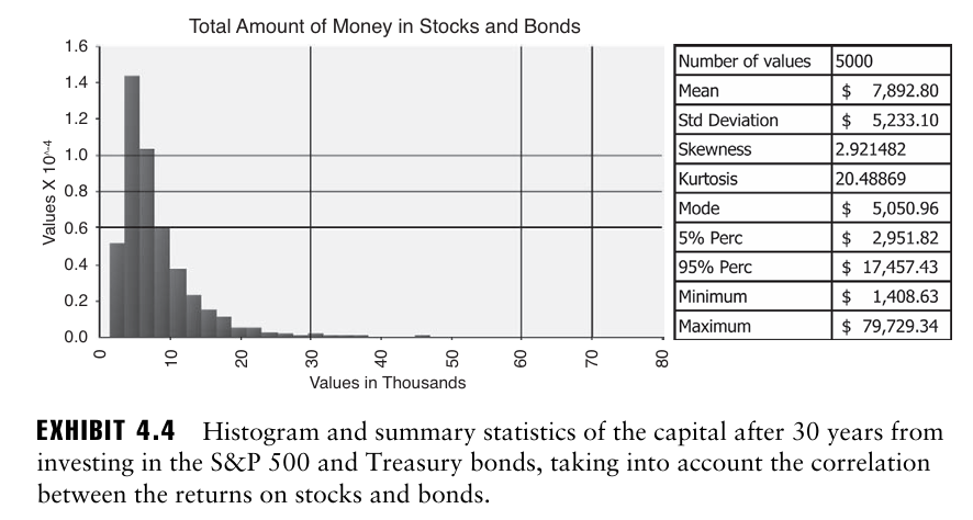 자본의 50%를 인덱스 펀드에, 50%는 채권에 투자하며, 30년동안 리밸런싱이 이루어지지 않는다고 가정하자. 또한 주식시장과 국채시장 수익률 간의 상관관계가 약 -0.2, 국채 연간 수익률이 평균 4%, 표준편차 7%인 정규분포를 따른다고 가정.