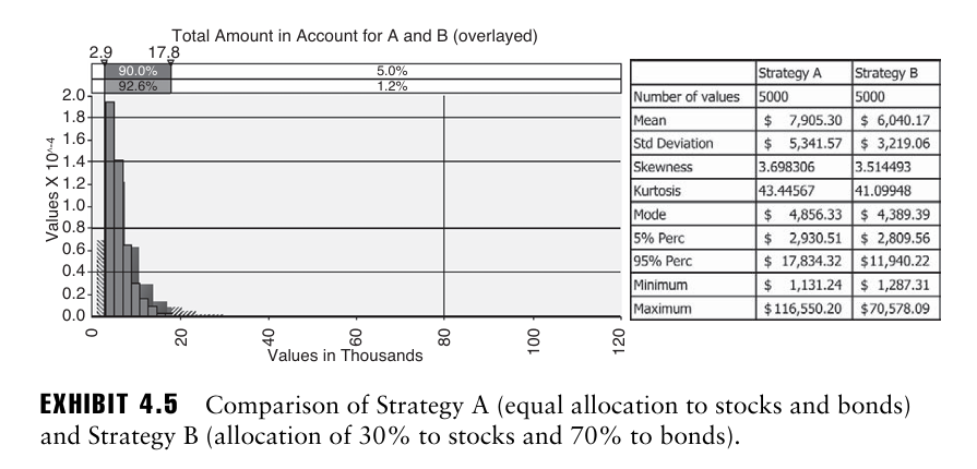 - EXIHIBIT 4.5에 따르면 A가 B보다 위험해 보였음에도 불구하고 5000개의 생성 시나리오 중 A가 B보다 실현 결과가 낮다는 것(10.2%만이 0보다 작은 값을 가짐).
