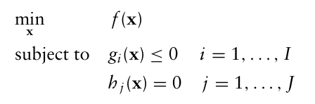 - $(g_i(x), h_j(x)), i=1,…,I \, j=1,…,J$ 로 정의된 제약 조건 집합. 일반적인 형태는 $g_i(x) \leq 0$ 및 $h_j(x) = 0$