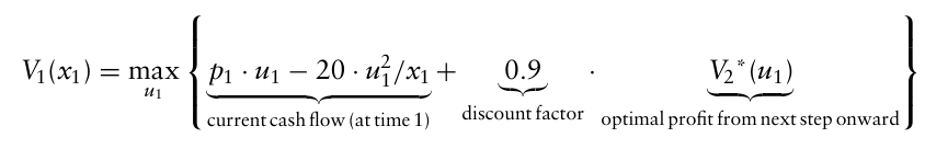 다행히도, 동적계획법 재귀(dynamic programming recursion)를 사용하여 이 문제를 풀 수 있는데, 2년차의 시작지점에 있다고 가정했을 때 어떤 상태 $x_2$ 에 대한 가치함수 $V_2(x_2)$ 는 다음과 같다.