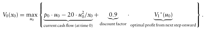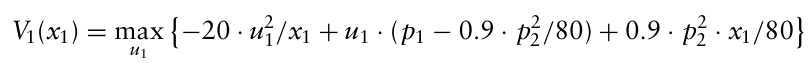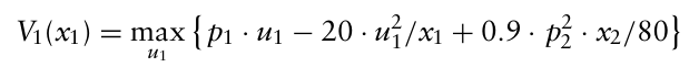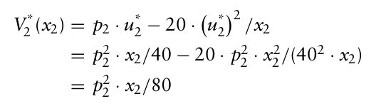 $V_2(x_2) = \max\limits_{u_2} ( p_2 u_2 - 20 \frac{u_2^2}{x_2} )$