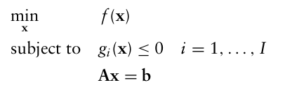 이때 $f(x)$ 와 $g_i(x)$ 모두 볼록 함수이며, $Ax = b$ 는 선형 방정식이다.