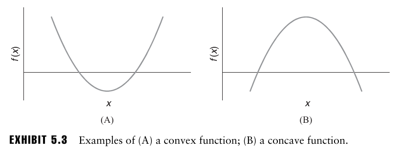 단일변수 x의 볼록함수는 다음과 같은 형태를 가지는데, 볼록함수는 곡선 위의 임의의 두 점을 연결하는 선이 항상 곡선 위에 위치하며, 오목 함수는 곡선 위의 임의의 두 점을 연결하는 선이 곡선 아래에 위치한다.
