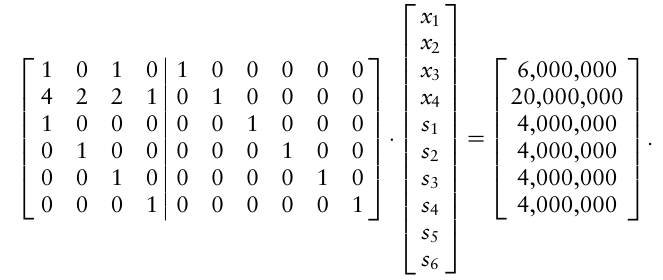 이를 위해 slack variables 라고 불리는 추가 비음수 변수 $s = (s_1, …, s_6)$ 를 도입하여 부등식 제약조건에 추가해준다.