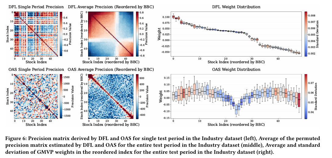 그림 6(중앙 패널)은 순열된 DFL 정밀도 행렬을, 오른쪽 패널은 순열된 정밀도 행렬에서 계산된 평균 GMVP 가중치를 나타낸다.