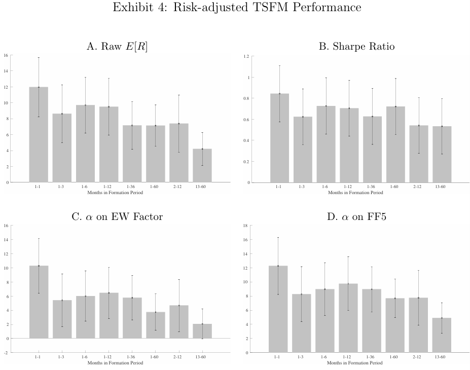 - 패널 A에서 TSFM은 모든 기간에 대해 기대수익률을 가지며 TSFM의 2-12 윈도우의 경우만 UMD로 어느정도 설명이 가능하다.