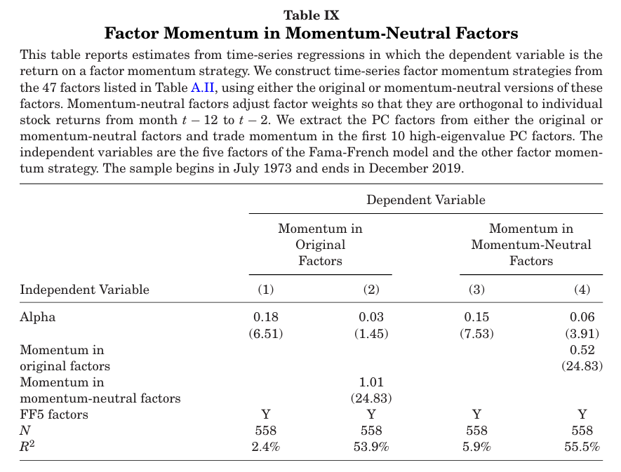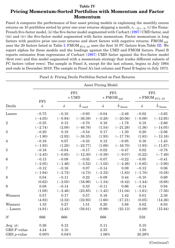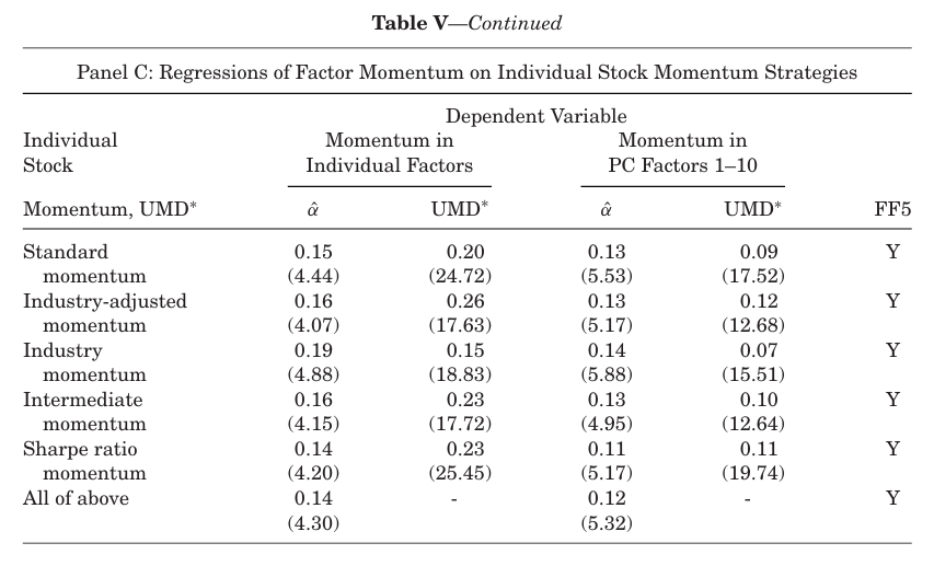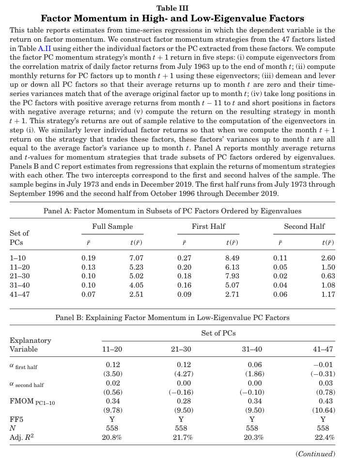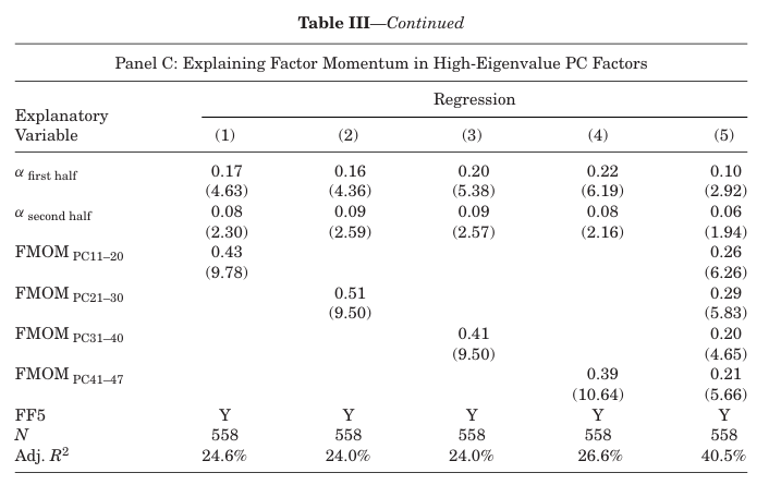 상위 10개의 PC를 거래하는 전략은 t=6.51로 유의미한 5팩터 모델의 알파를 가진다. 이들은 다른 PC 집합의 모멘텀을 거의 흡수한다.