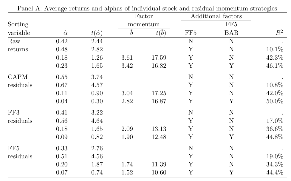 인터넷 부록 Section VI에서는 잔차 모멘텀 전략이 실제로 유의미하게 베타에 대해 반대 베팅을 하고 있음을 보인다. 이 전략의 5팩터 모델 알파가 평균 수익보다 큰 이유는 이러한 베타 반대 베팅 때문이며 베타에 대한 반대 베팅 팩터를 통제하면 팩터 모멘텀 전략이 세가지 잔차 모멘텀 전략을 포괄한다.