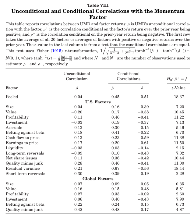 표 8은 이러한 무조건적 상관관계가 0에 가까운 이유는 이 상관관계가 시간에 따라 유의미하게 변하기 때문임을 보여준다. 따라서 실제로 모멘텀 팩터(UMD)는 다른 팩터들과 관련이 있다고 할 수 있다.