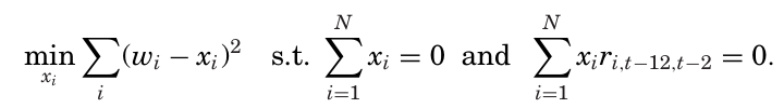→ 이 문제의 해 $x_i$ 는 원래 가중치 $w_i$ 를 과거 수익에 대해 횡단면 회귀했을 때의 잔차와 동일.