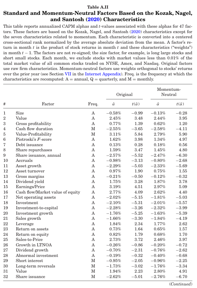 표 A.II는 47개 모멘텀 중립 팩터에 대한 연환산 CAPM 알파를 보여준다(위 사진은 일부분만 존재).