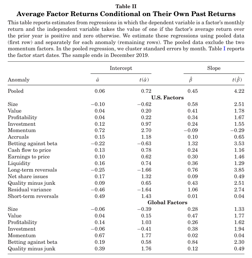 먼저 팩터의 과거 수익률이 미래 수익률에 대한 정보를 제공한다는 것을 보여주며, 이 효과는 본 논문에서 연구한 20개의 팩터에서 경제적, 통계적으로 큰 효과를 보인다.