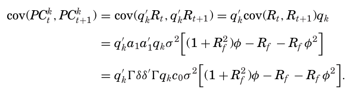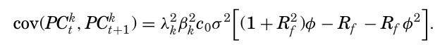 ※ $R_{t+1}$ 의 수익률 식에서 상수인 a, D 는 제외하고 공분산을 계산하면 $\text{cov}(R_t,R_{t+1})=\text{cov}(a_1(\xi_t-R_f\xi_{t-1}),a_1(\xi_{t+1}-R_f\xi_t))$